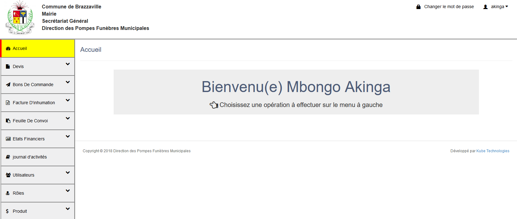Dans un soucis de se munir d'un système de gestion performant, au vu des lacunes de l'existant (Logiciel existant mono poste, Utilisation en ligne de commande, Les opérations de lecture manuelles directement effectuées depuis la base de données, etc .. ) la direction des pompes funèbres a confié à KUBE TECHNOLOGIES la mission de moderniser son système de gestion en développant un nouveau système moderne et mieux adapté à leurs besoins.